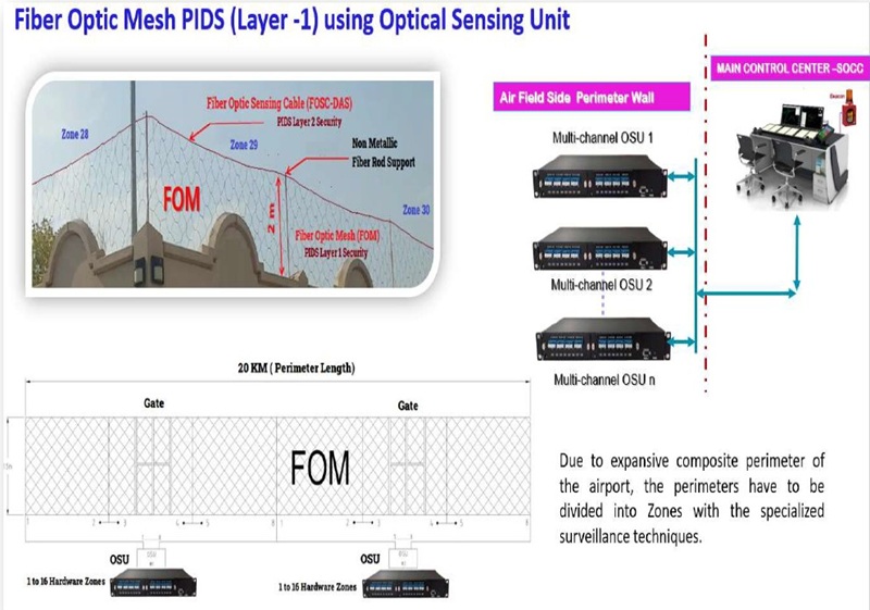 The Spectron PIDS system functions through a multi-tiered security architecture. FiberMesh sensors are installed along or outside the perimeter wall—independent of existing fencing infrastructure. These detect even minor contact or climbing attempts and instantly trigger alerts in the Command & Control Center (CCC). The AI-powered CCTV system simultaneously tracks intruder movement, activates facial recognition, and coordinates response through integrated alarms. Zoning the hardware ensures system resilience—any breach is contained within its zone, maintaining full operational capability elsewhere. In sensitive zones like ILS areas or drainage paths, specialized configurations prevent interference and enable proactive security enforcement.
